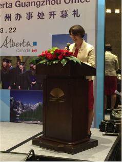 加拿大驻广州总领事白静芳女士(Rachael Bedlington)用中英双语对各界代表的到来表示感谢,并带来了加拿大驻广州总领事馆对艾伯塔省政府驻广州办事处成立的官方祝福。广东省商务厅陈越华副厅长表示,希望通过毕德龙部长访穗及艾伯塔省政府驻广州办事处的成立,进一步促进双方的了解,增强贸易和投资。