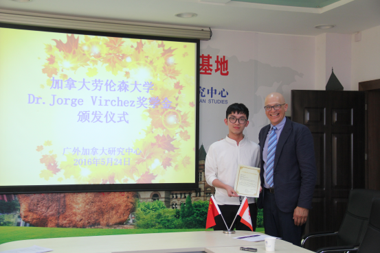 Dr.Jorge Virchez奖学金由Virchez博士个人出资设立,帮助世界各地的贫困本科学生到加拿大进行为期2-3周的生活学习,增进各国青年对加拿大的了解,鼓励他们努力奋斗。奖学金今年首次授予中国学生,奖学金选拔工作由Virchez博士委托广外加拿大研究中心实施。中心审核了申请人的学习成绩、研究计划,最终确定高翻学院本科生汪嘉琪入选,Virchez博士亲自前来颁发奖学金。