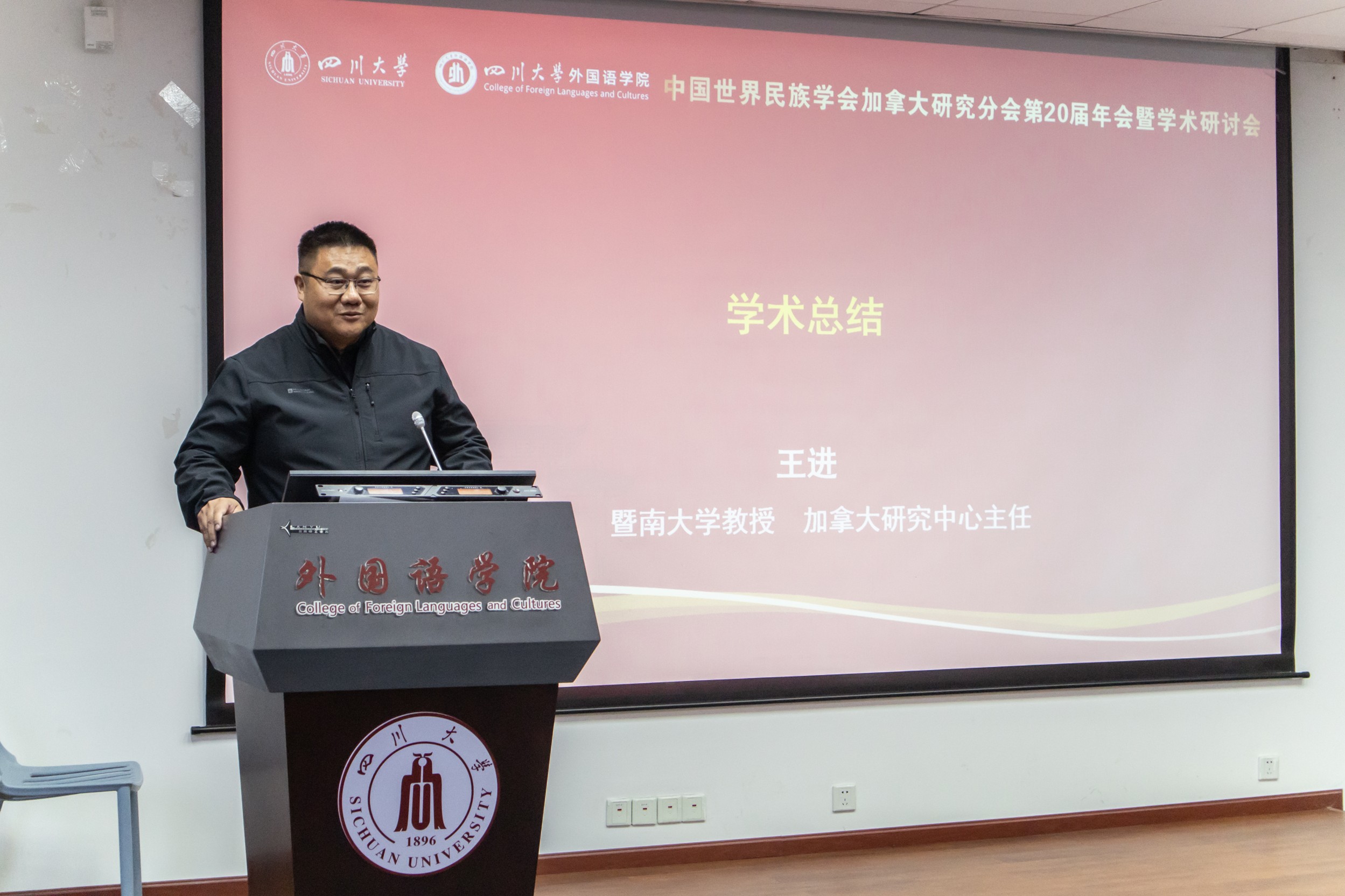 暨南大学王进教授作论坛总结发言。王进教授对本次论坛取得的成果作了高度评价。他表示,主旨发言立意深远、精彩纷呈,引发了热烈反响;各分论坛的报告研究主题广泛,研究方法多元化,充满当代价值和意义。王进教授再次向所有为本次论坛作出贡献的老师、专家评委、同学以及志愿者表示感谢。最后,王进教授作为下一届承办单位代表诚挚地邀请在座师生以及加拿大研究学界同仁于2027年齐聚暨南大学,共探学科发展新路径,共襄学术交流新盛举。中国世界民族学会加拿大研究分会第20届年会暨学术研讨会圆满结束。